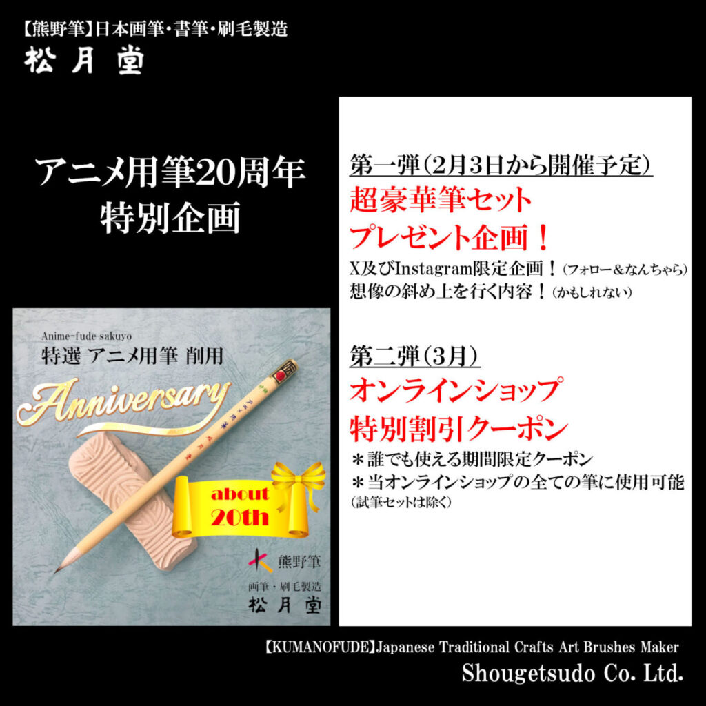 当社オンラインショップ(日本国内版)にて使用可能な期間限定の割引クーポンを発行いたしました!特選アニメ用筆削用の20周年を記念して、当オンラインショップで使える期間限定20%オフクーポンを発行しております。