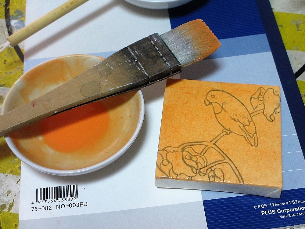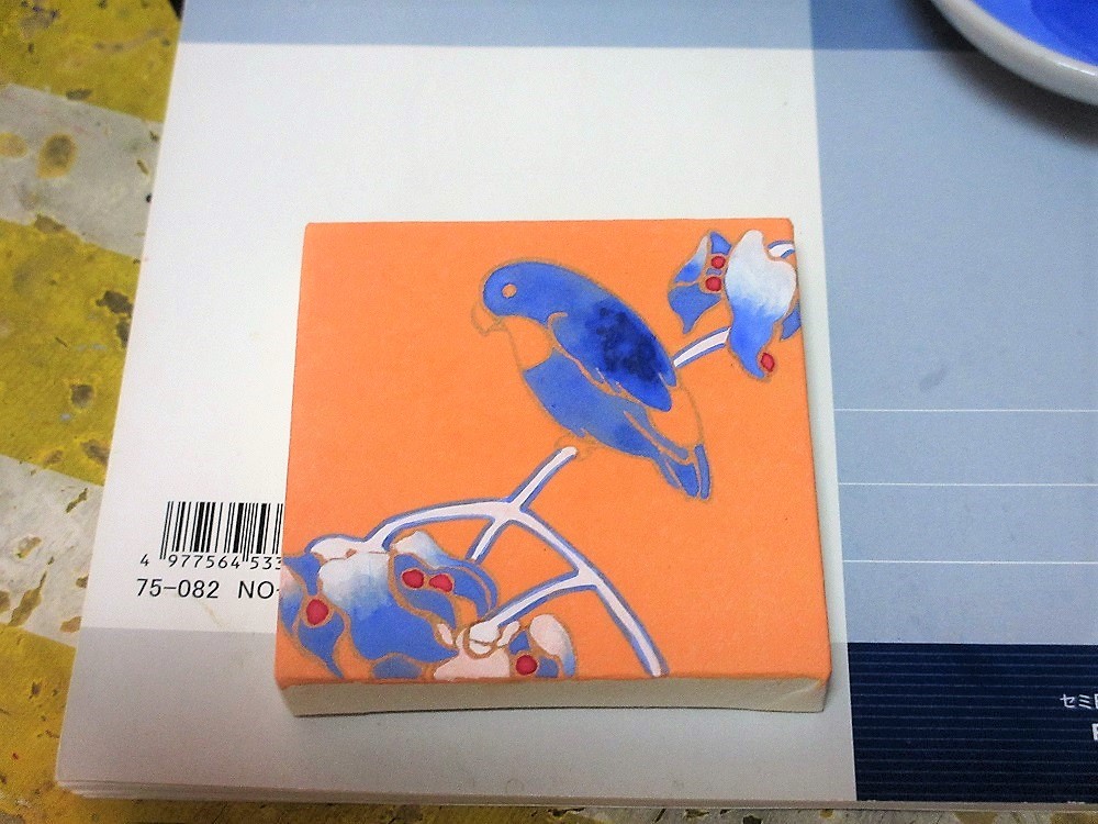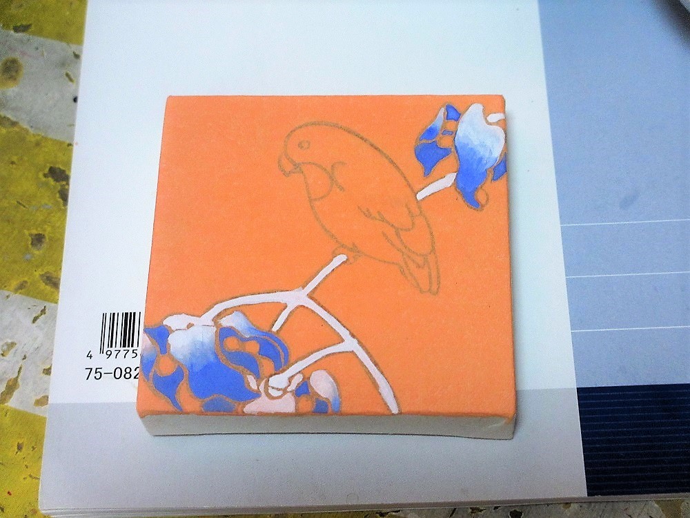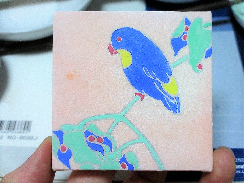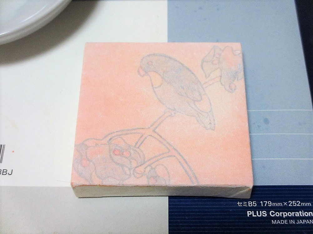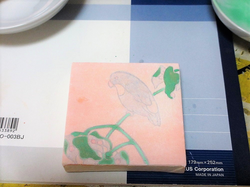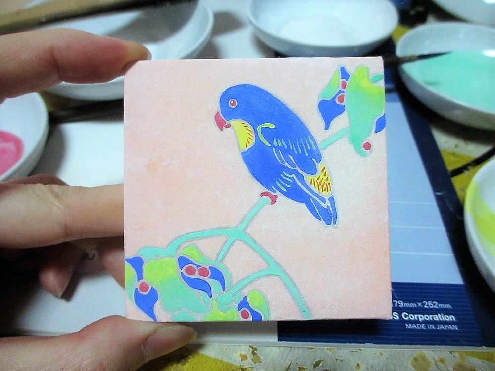 まだ、のっぺりしていますので、細部の鳥の羽や、青桐のさやを塗っていきます。